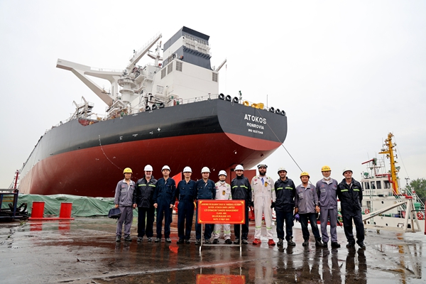 5月21日上午,西區(qū)2#塢內新建1#295000噸油船順利實現(xiàn)下水大節(jié)點。