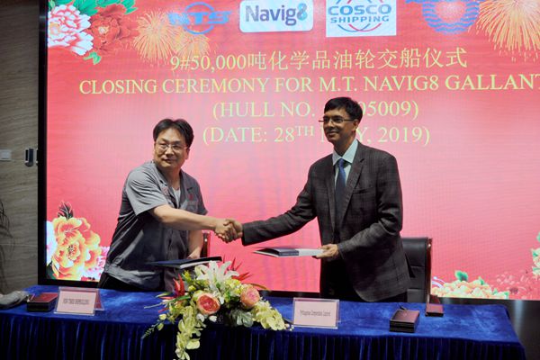 5月28日,公司舉行交船簽字儀式,9#50000噸化學(xué)品油船完工交付船東。