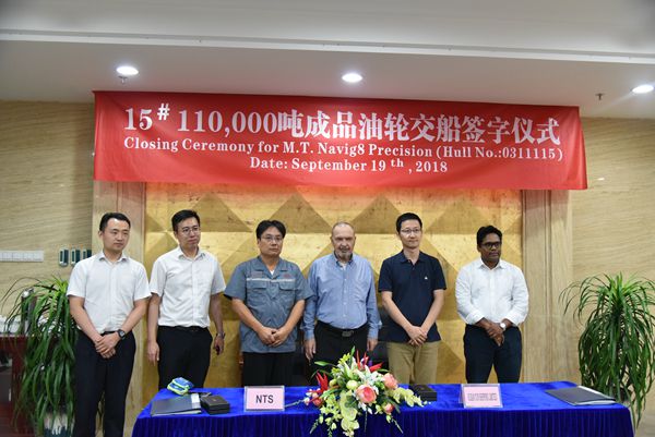 9月19日下午,公司常務(wù)副總張玉永與船東Navig8公司代表共同簽署交船文本,15#110000噸油船正式交付船東。
