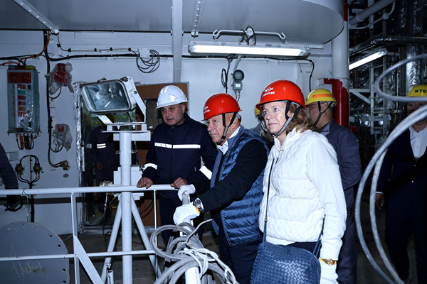Procopiou一行還實地考察了Dynacom訂購的73500噸油輪系列的首制船建造情況,常務(wù)副總經(jīng)理張玉永與Dynacom駐廠經(jīng)理Romeo Mustata一起陪同Procopiou夫婦登上該船,并就船舶的建造細節(jié)進行了現(xiàn)場交流。該船于2025年9月19日下水,目前正處于碼頭舾裝的關(guān)鍵階段。根據(jù)目前建造進度該船將于2026年1月初正式交付投入運營。Procopiou一行深入船艙內(nèi)部,仔細查看了施工細節(jié),對船舶的建造質(zhì)量及項目管理的井然有序表示高度認可,對這款設(shè)計先進、性能優(yōu)異的油輪充滿期待,堅信新船的加入將為Dynacom船隊注入新的活力。