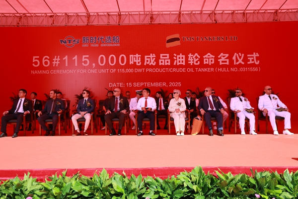 常務(wù)副總經(jīng)理張玉永致歡迎辭,他說,今天,我們懷著無比自豪與激動(dòng)的心情齊聚一起,見證歷史性時(shí)刻——為希臘TMS建造的56#115000噸油船舉行命名儀式。我們與TMS的合作始于2022年12月,至今已成功交付6艘船舶,包括4艘蘇伊士型(SUEZMAX)和2艘LR2型船舶,今天命名的這艘船是LR2系列船舶的收官之作,也是雙方合作的第7艘船舶,衷心感謝TMS的信任,并期待在未來幾年繼續(xù)深化富有成效的合作關(guān)系。自2024年11月船舶開工建造以來,無數(shù)人精心參與打造這艘巨輪,每個(gè)焊縫、每項(xiàng)檢測、每個(gè)細(xì)節(jié)都凝聚了大家辛勤付出的智慧和汗水,確保了船舶建造安全高效,如今她承載著我們合作各方“駛向全球海域的愿景”即將揚(yáng)帆遠(yuǎn)航,讓我們一起為她祝福。